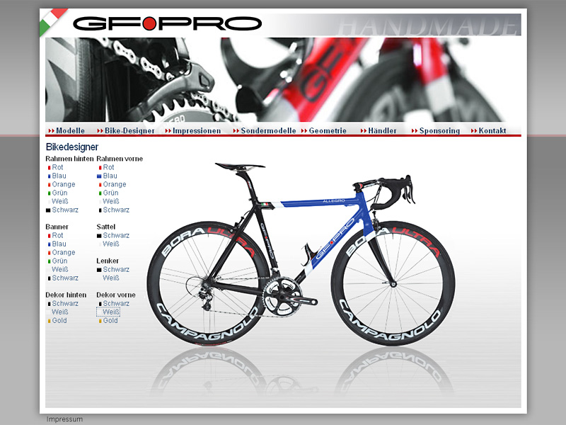 Internetauftritt mit hochauflösenden Bildern. Mit dem "Bike-Designer" kann der Kunde sein Rad selbst gestalten.