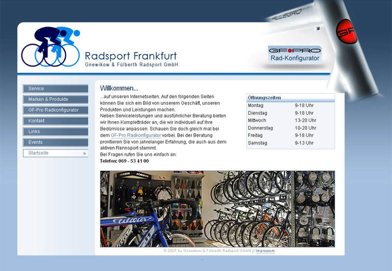 Internetauftritt der Gnewikow und Fülberth Radsport GmbH. Mit dem "Rad-Konfigurator" kann der Kunde sein Rad nach eigenen Wünschen konfigurieren.